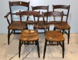 Set of five (one arm, four sides) early 20th century pub chairs. Repair to one seat; 16" w., 12" d., 31 1/2" h. Set of five (one arm, four sides) early 20th century pub chairs. Repair to one seat; 16" w., 12" d., 31 1/2" h.