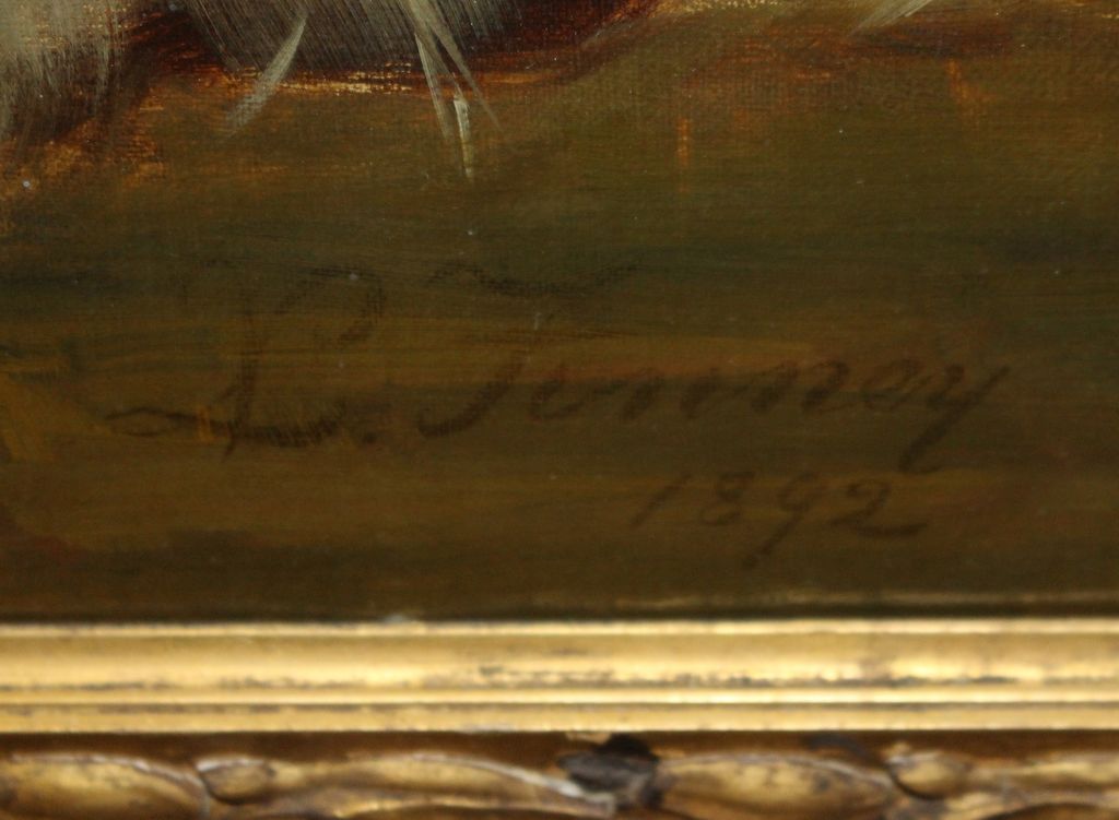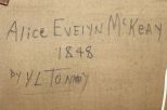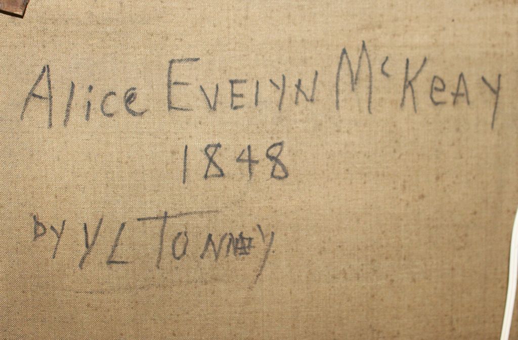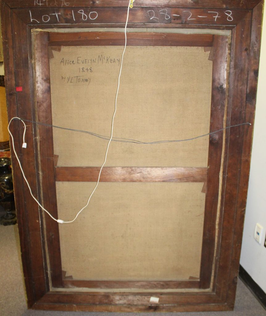 Large oil on canvas of a young lady reading. Portrait of Alice Evelyn McKee (Scottish). Has plaque bearing the name V.L. Tonney. Back side is written Y.L. Tonney; 51" w., 72" h. Large oil on canvas of a young lady reading. Portrait of Alice Evelyn McKee (Scottish). Has plaque bearing the name V.L. Tonney. Back side is written Y.L. Tonney; 51" w., 72" h.