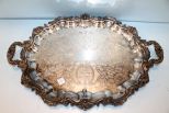 Heavy double handled silverplate footed tray; 27" w. Heavy double handled silverplate footed tray; 27" w.