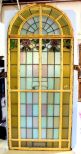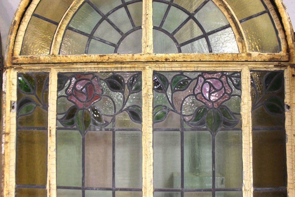 Lovely pair of rounded top stain glass windows of roses, transom top, in iron frames; 8' 4 1/2" h., 3' 6 3/4" w. Lovely pair of rounded top stain glass windows of roses, transom top, in iron frames; 8' 4 1/2" h., 3' 6 3/4" w.