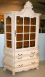 Hand brushed painted French bombay shaped base china cabinet with carved crest; 52" w., 87" h., 18" d. Hand brushed painted French bombay shaped base china cabinet with carved crest; 52" w., 87" h., 18" d.
