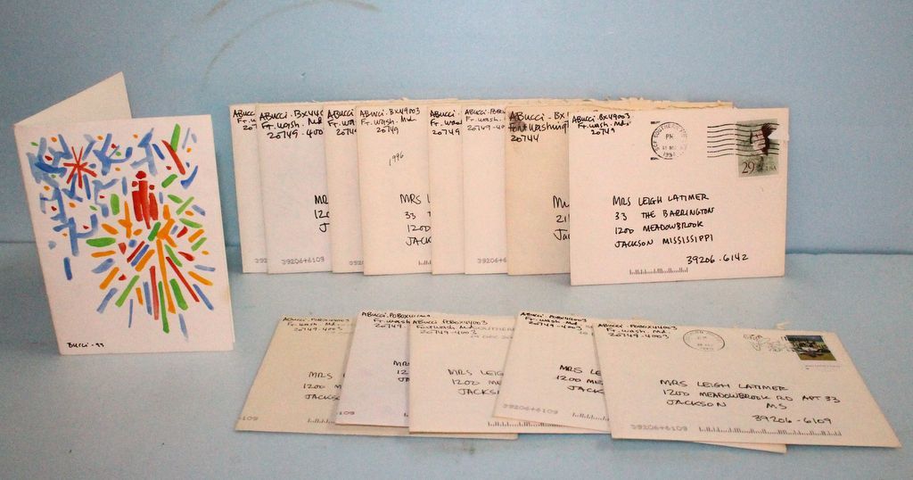 Group of eighteen Andrew Bucci Christmas cards sent to Leigh Latimer. Earliest being 1975 Group of eighteen Andrew Bucci Christmas cards sent to Leigh Latimer. Earliest being 1975