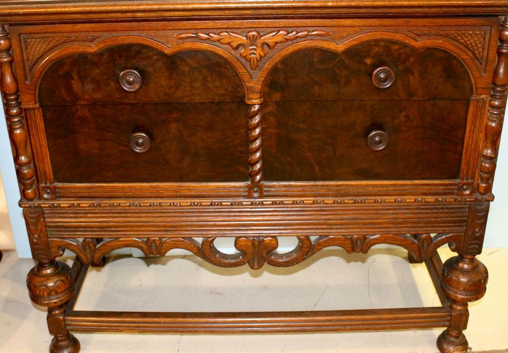 1940's ornate walnut and oak Jacobean style china cabinet. Top section has carved door, cantered corners, bottom has two drawers; 41 1/2" w., 18 1/2" d., 63 1/2" h. 1940's ornate walnut and oak Jacobean style china cabinet. Top section has carved door, cantered corners, bottom has two drawers; 41 1/2" w., 18 1/2" d., 63 1/2" h.