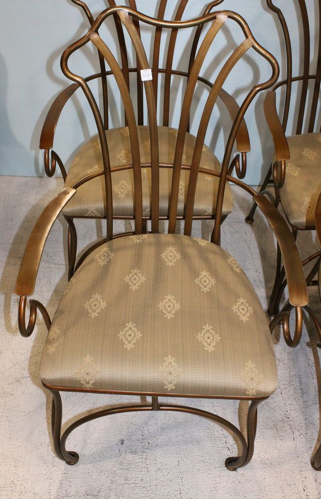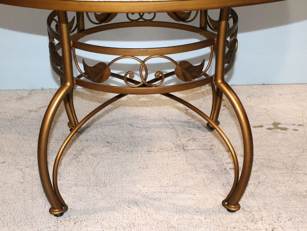 Large marble top and iron base breakfast table with four chairs; table, 47" dia., 30" h. Large marble top and iron base breakfast table with four chairs; table, 47" dia., 30" h.