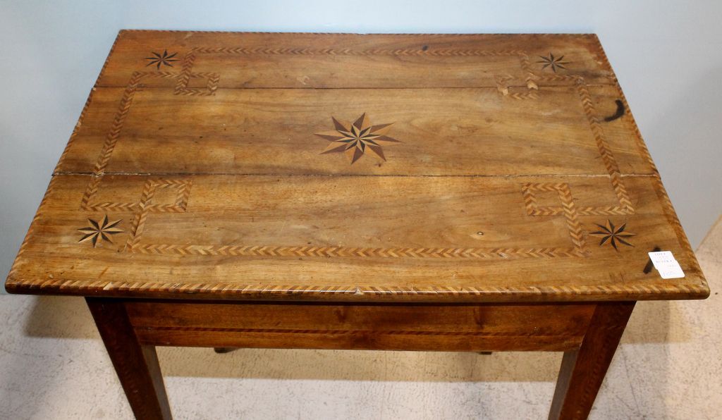 Taper leg Louisiana style inlaid side table with center drawer. Top has beautiful star inlay; 28 1/2" w., 20 1/2" d., 30" h. Taper leg Louisiana style inlaid side table with center drawer. Top has beautiful star inlay; 28 1/2" w., 20 1/2" d., 30" h.