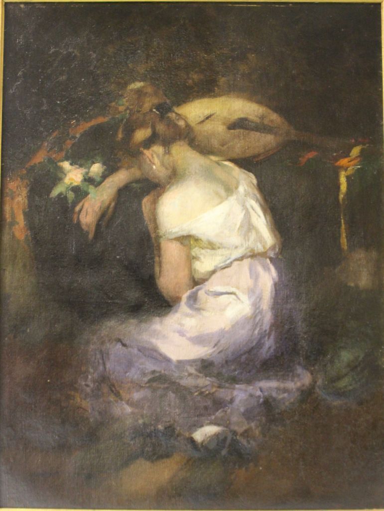 Oil on canvas of "Lady Resting" by Marcel Jombon (1848-1908) French, signed lower left. Reverse side of painting is oil painting of what appears to be French house showing windows; 28" w., 37" h. Oil on canvas of "Lady Resting" by Marcel Jombon (1848-1908) French, signed lower left. Reverse side of painting is oil painting of what appears to be French house showing windows; 28" w., 37" h.