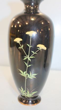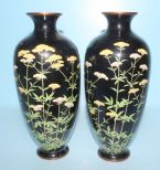 Pair of late nineteenth century, black cloisonne vases with yellow and white flowers; 20" h. Pair of late nineteenth century, black cloisonne vases with yellow and white flowers; 20" h.