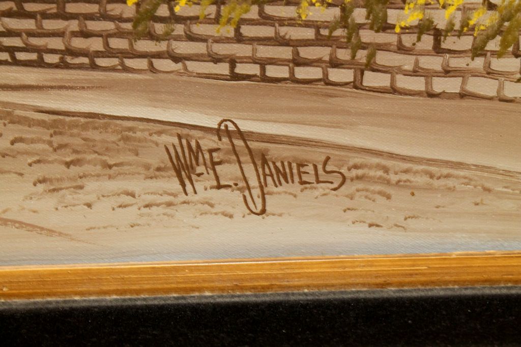 Oil painting depicting trolley car on San Francisco street with Victorian houses, and signed lower right W.M.E. Daniels (William E. Daniels, American 1908-1995) ; 54" w., 29" h. Oil painting depicting trolley car on San Francisco street with Victorian houses, and signed lower right W.M.E. Daniels (William E. Daniels, American 1908-1995) ; 54" w., 29" h.