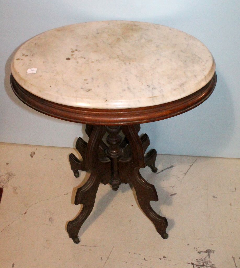 19th century Victorian white oval marble top table; 25" w., 20" d., 29" h. 19th century Victorian white oval marble top table; 25" w., 20" d., 29" h.