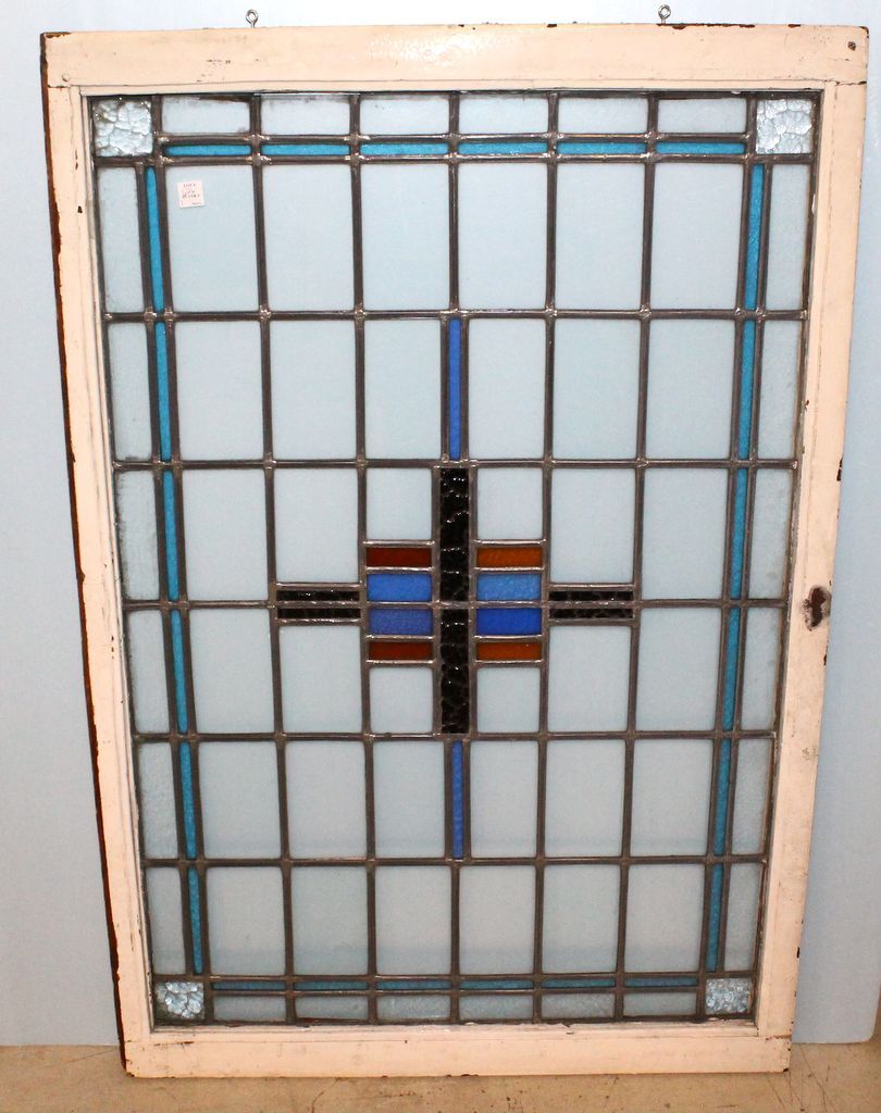 626 Antique Prairie School Style Blue and Gold Geometric Stained Leaded Glass Window
