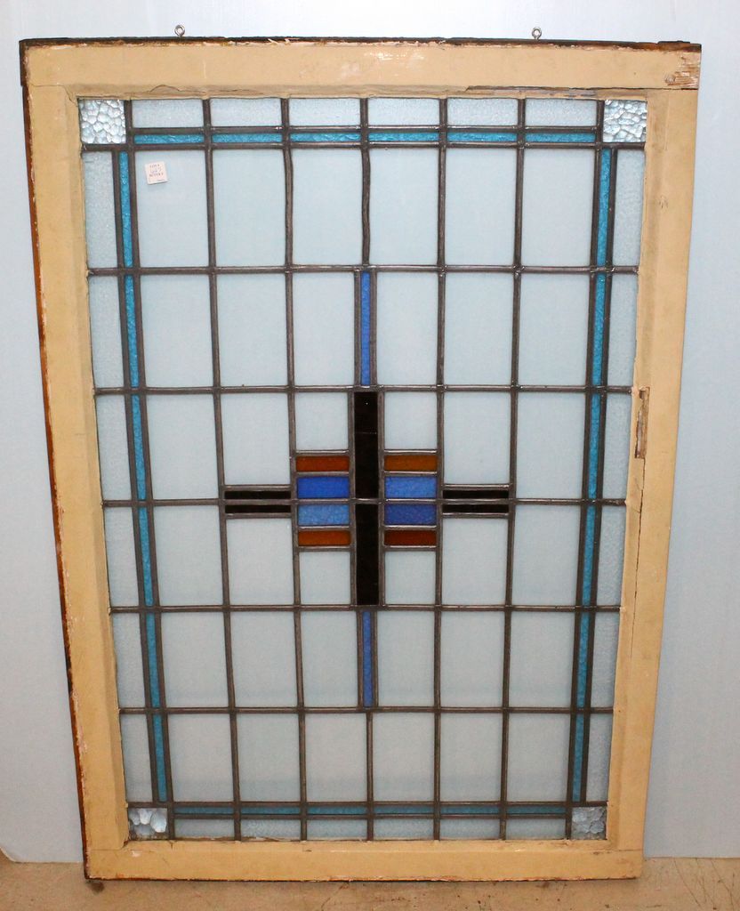 627 Antique Prairie School Style Blue and Gold Geometric Stained Leaded Glass Window