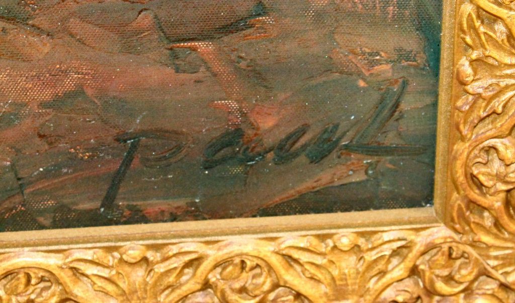 Textured oil painting of parlor with musical instruments in ornate gold frames; 45 1/2" square. Textured oil painting of parlor with musical instruments in ornate gold frames; 45 1/2" square.