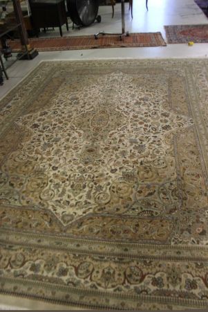 Turkish angora Oushak Tabriz rug with ivory field; 9' 3" w., 13" l. Turkish angora Oushak Tabriz rug with ivory field; 9' 3" w., 13" l.