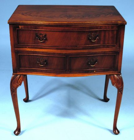 English, walnut two drawer stand, serpentine front on carved Queen Ann legs 24 1/2"w , 17"d, 24"h. English, walnut two drawer stand, serpentine front on carved Queen Ann legs 24 1/2"w , 17"d, 24"h.