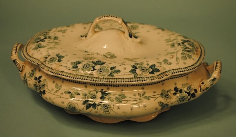 F & Sons English oval covered tureen decorated with blue-green flowers F & Sons English oval covered tureen decorated with blue-green flowers