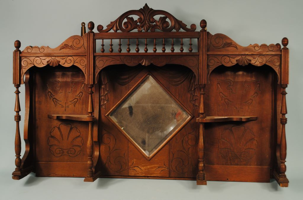 Walnut Victorian oval mantel mirror or organ top. Center with diamond shaped mirror, crest with spool carving, brackets and shelves supported by spools. 51" w x 35" h Walnut Victorian oval mantel mirror or organ top. Center with diamond shaped mirror, crest with spool carving, brackets and shelves supported by spools. 51" w x 35" h