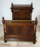 English Oak heavily carved bed. Urn design gallery ending in finials with head and garland carving over paneled headboard. Footboard has fretwork ending in finials, carved Shakespearn heads in each panel up on bun feet.53"w.77"l,661/2h. English Oak heavily carved bed. Urn design gallery ending in finials with head and garland carving over paneled headboard. Footboard has fretwork ending in finials, carved Shakespearn heads in each panel up on bun feet.53"w.77"l,661/2h.