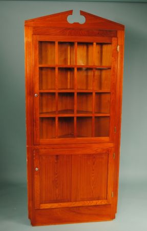 19th century English pine corner cabinet with pediment. Top section having single glass door divided into 16 panels, interior with three shelves, bottom having single door with two raised panels. 38" w x 19" d x 87 1/2" h 19th century English pine corner cabinet with pediment. Top section having single glass door divided into 16 panels, interior with three shelves, bottom having single door with two raised panels. 38" w x 19" d x 87 1/2" h