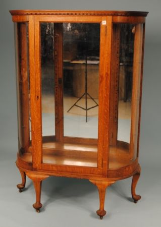 20th century Queen Ann style oak china cabinet. Curved glass sides, crack in one side. Has three glass shelves. 43" w x 15 1/2" d x 64 1/4" h 20th century Queen Ann style oak china cabinet. Curved glass sides, crack in one side. Has three glass shelves. 43" w x 15 1/2" d x 64 1/4" h