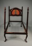 19th Pair mahogany twin beds. Medallion headboard with upholstered stripe fabric supported by flute post ending in carved frames. 5ft h x 34" w x 73" L 19th Pair mahogany twin beds. Medallion headboard with upholstered stripe fabric supported by flute post ending in carved frames. 5ft h x 34" w x 73" L