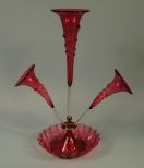 Victorian cranberry glass epergne. Center 2 side arms fit into glass ruffled base. 22" h Victorian cranberry glass epergne. Center 2 side arms fit into glass ruffled base. 22" h