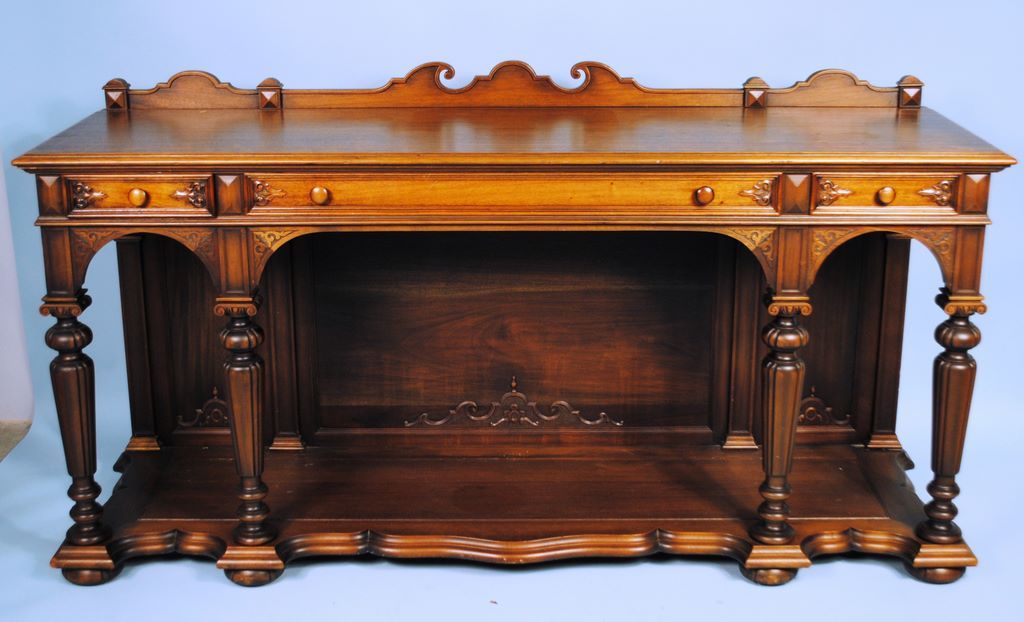 walnut carved sideboard with backsplash. Three drawers, lower section has carved back, shelf , all supported by turned columns walnut carved sideboard with backsplash. Three drawers, lower section has carved back, shelf , all supported by turned columns