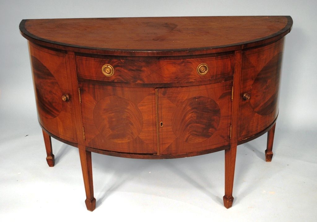 Demi-lune Hepplewhite style sideboard banded top with center drawer over two doors with brass astragal flanked by two doors. 54" w x 23" d x 34"h Demi-lune Hepplewhite style sideboard banded top with center drawer over two doors with brass astragal flanked by two doors. 54" w x 23" d x 34"h