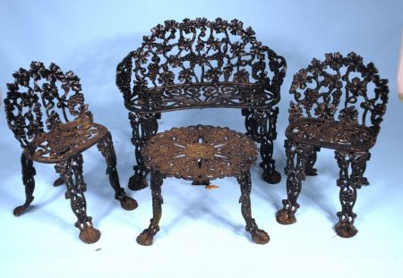 Four pieces of vintage grape and vine design iron garden set consisting of settee (37 1/2"w) two arm chairs and table Four pieces of vintage grape and vine design iron garden set consisting of settee (37 1/2"w) two arm chairs and table