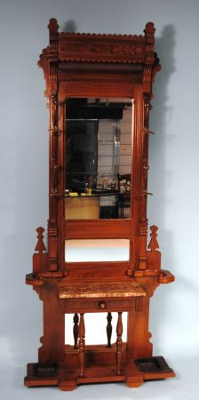 Mid 19th Century walnut Victorian hall tree. Top in Eastlake design, center mirror with four original brass hooks, over marble top drawer flanked by umbrella arms, base having iron pans. 35 1/2"w,10"d,86 1/2 "h. Mid 19th Century walnut Victorian hall tree. Top in Eastlake design, center mirror with four original brass hooks, over marble top drawer flanked by umbrella arms, base having iron pans. 35 1/2"w,10"d,86 1/2 "h.