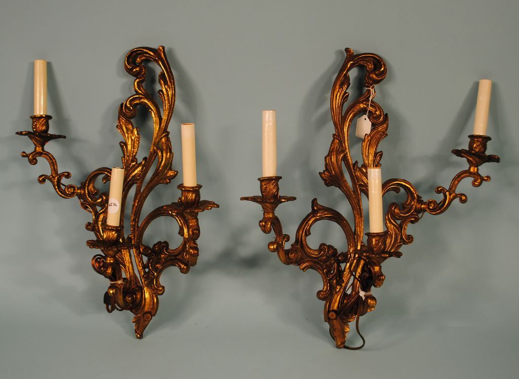 Pr. Louis XV style three light wall sconces w. 19", h.20" Pr. Louis XV style three light wall sconces w. 19", h.20"