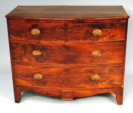 Early 19th century regency mahogany chest, bowed top above a case fitted with two drawers over three long graduated drawers raised on splayed bracket fee. Interior of drawers have original blue paper.44"w,23"d,36"h. Early 19th century regency mahogany chest, bowed top above a case fitted with two drawers over three long graduated drawers raised on splayed bracket fee. Interior of drawers have original blue paper.44"w,23"d,36"h.