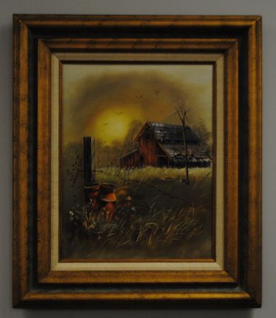 Signed J.. Hunter painting of barn and milk jugs. 22"w, 26 1/2"h. Signed J.. Hunter painting of barn and milk jugs. 22"w, 26 1/2"h.