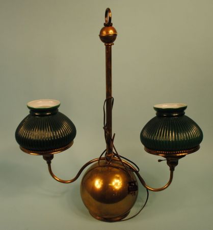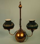 brass fixture which was made into lamp. Two green shades supported by delicate brass arms.23 1/2"w. 27 1/2 "h. brass fixture which was made into lamp. Two green shades supported by delicate brass arms.23 1/2"w. 27 1/2 "h.