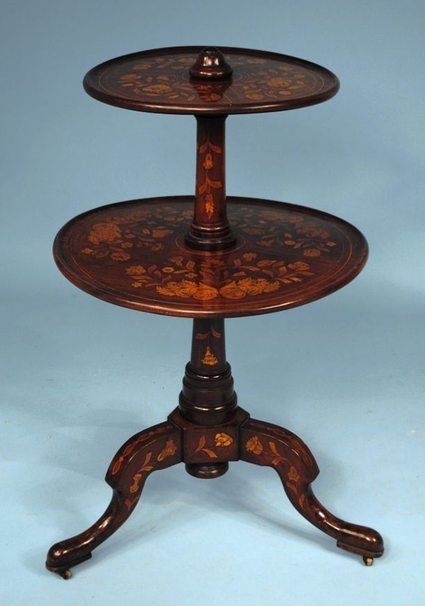 19th century mahogany two tier dumb waiter table. Each tier with string inlay and flower inlay, turned inlay Post, all supported by pad feet. ( warp in one top) 39"h,24"w 19th century mahogany two tier dumb waiter table. Each tier with string inlay and flower inlay, turned inlay Post, all supported by pad feet. ( warp in one top) 39"h,24"w