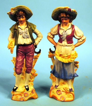 Pr. Bisque hand-painted figurines of young man and lady h.11" Pr. Bisque hand-painted figurines of young man and lady h.11"