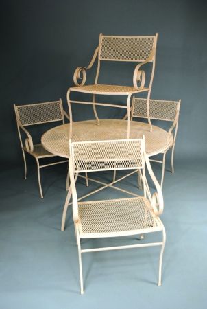 324 Painted White Vintage Iron Table and Four Arm Chairs