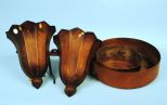 brass pan ( 15" dia.) brass pot(9 1/2" dia.) pr. Brass wall sconces/planters (10"wx l3 1/2"h.) brass pan ( 15" dia.) brass pot(9 1/2" dia.) pr. Brass wall sconces/planters (10"wx l3 1/2"h.)