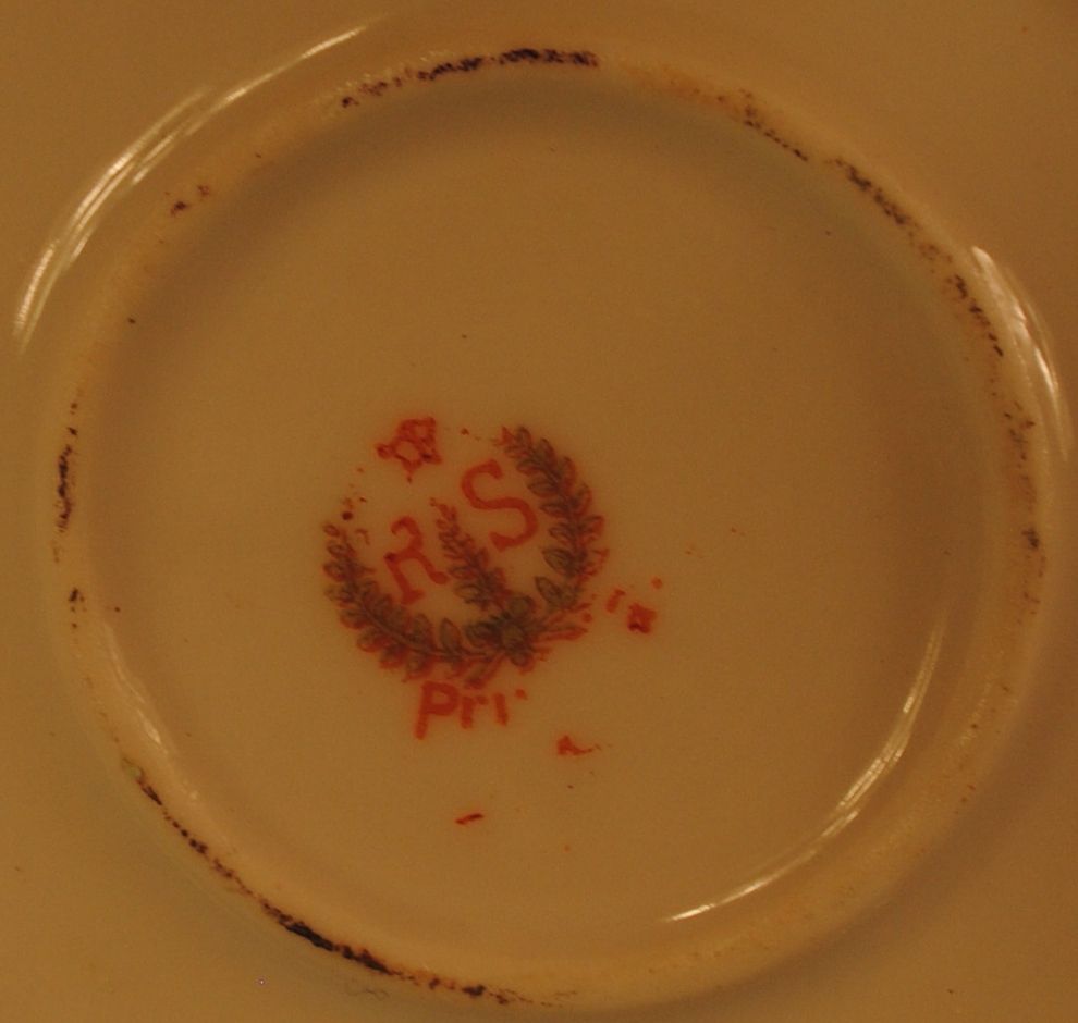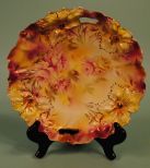 Two handled hand-painted cake plate. Pink and yellow flowers with scalloped edge. Red mark RS 10" dia. Two handled hand-painted cake plate. Pink and yellow flowers with scalloped edge. Red mark RS 10" dia.