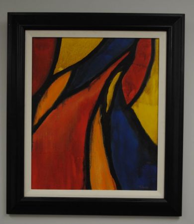 one bright red, yellow, blue, and black modern art painted-late 1960s. one bright red, yellow, blue, and black modern art painted-late 1960s.