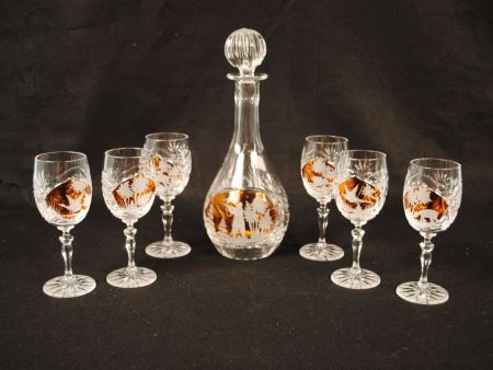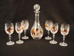 Intaglio cut amber to clear crystal decanter with six stems. Decanter woodland scene of hunter, each stem scene of birds. Decanter h.13", stems 6 1/2" Intaglio cut amber to clear crystal decanter with six stems. Decanter woodland scene of hunter, each stem scene of birds. Decanter h.13", stems 6 1/2"