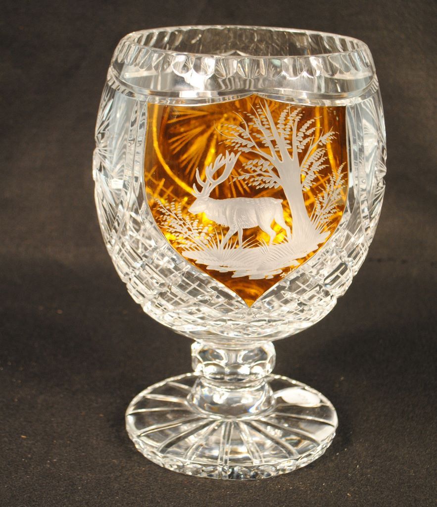 Intaglio cut amber to clear crystal pedestal bowl compote. Scene of stag.h.10 1/2", 5 3/4" dia. Intaglio cut amber to clear crystal pedestal bowl compote. Scene of stag.h.10 1/2", 5 3/4" dia.