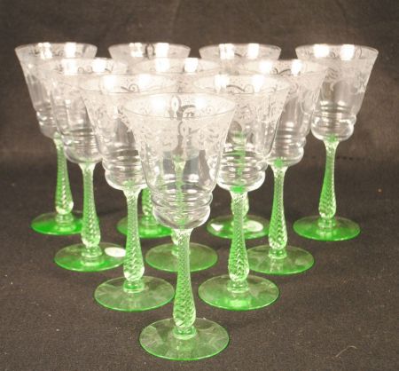 set of 10 elegant glass stems(green) with fancy etched border around top of each glass. 8 1/2"h. set of 10 elegant glass stems(green) with fancy etched border around top of each glass. 8 1/2"h.