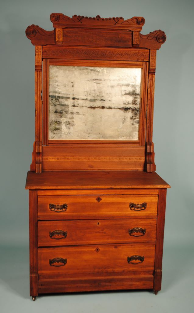 Victorian poplar stained walnut dresser with mirror top. Base has three drawers ,top with mirror and Eastlake design frame. 39"w,17 3/4"d 79"h. Victorian poplar stained walnut dresser with mirror top. Base has three drawers ,top with mirror and Eastlake design frame. 39"w,17 3/4"d 79"h.