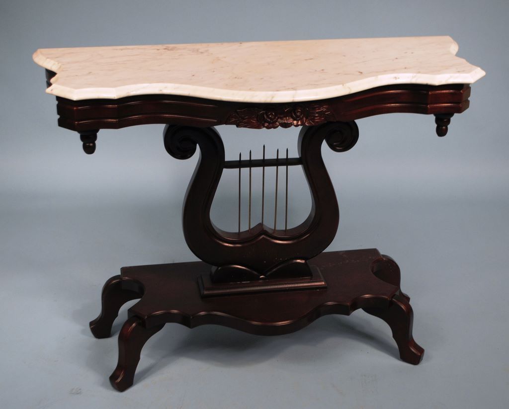Victorian style marble top console with lyre base. 40"w,18"d,30"h. Victorian style marble top console with lyre base. 40"w,18"d,30"h.
