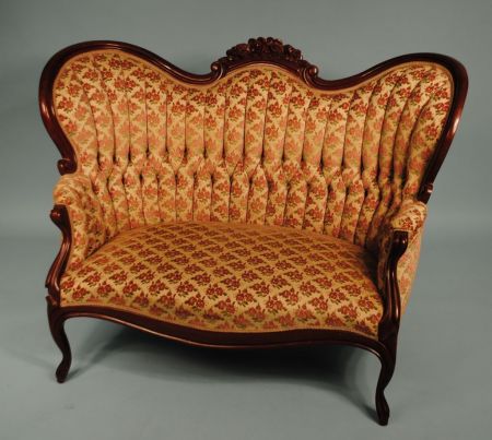 Reproduction Victorian style settee. Carved roses on the crest, rococo style legs, upholstered in rose design velvet. 53"w,28"d,39"h. Reproduction Victorian style settee. Carved roses on the crest, rococo style legs, upholstered in rose design velvet. 53"w,28"d,39"h.