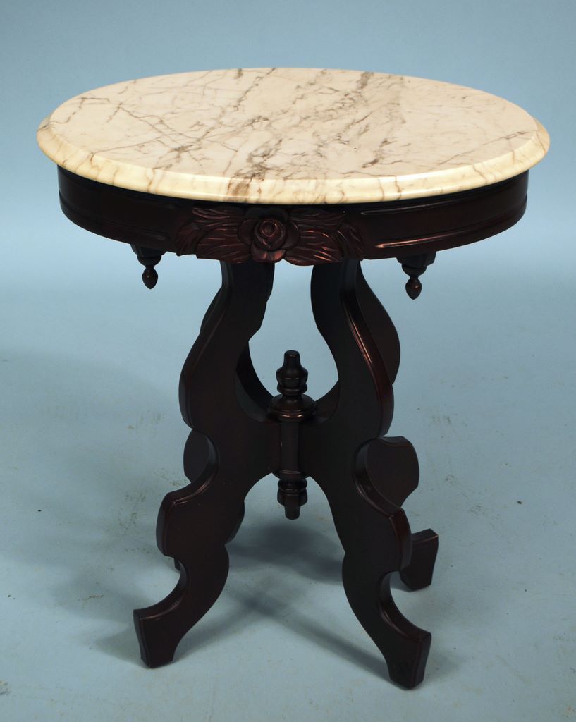 Victorian style side table with oval marble top 21 1/2"w,26"h. Victorian style side table with oval marble top 21 1/2"w,26"h.