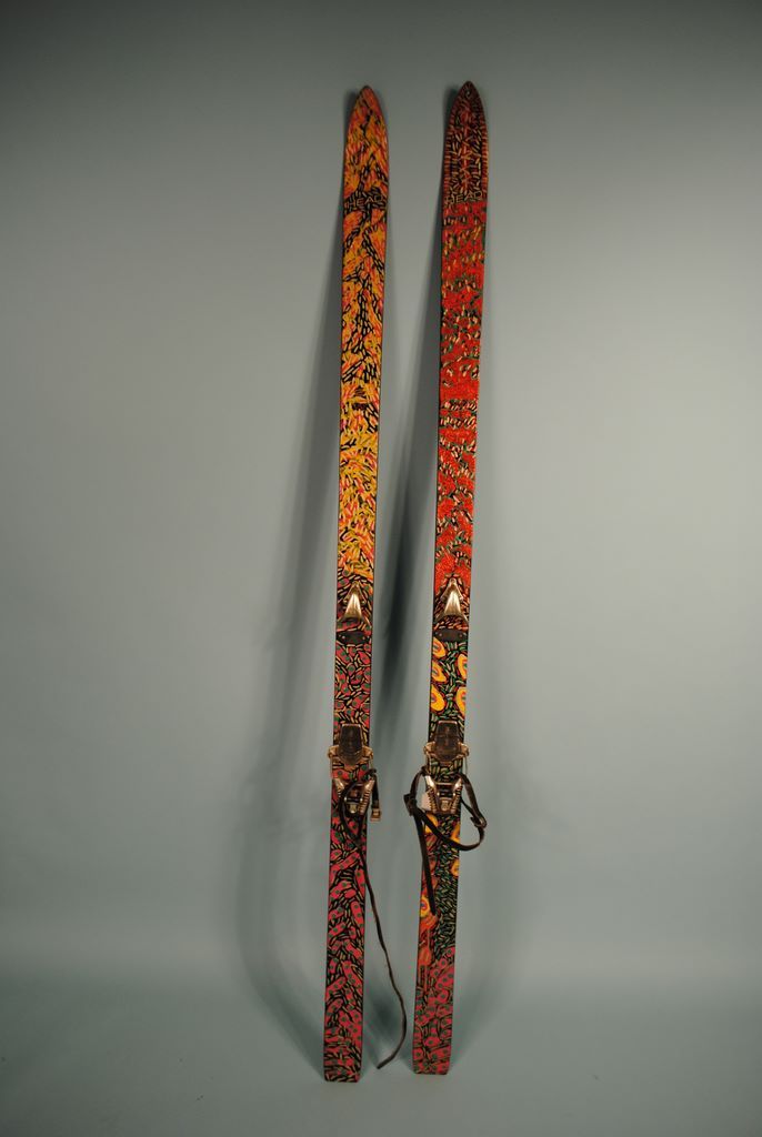 Pair of old hand painted cross country skis. Pair of old hand painted cross country skis.