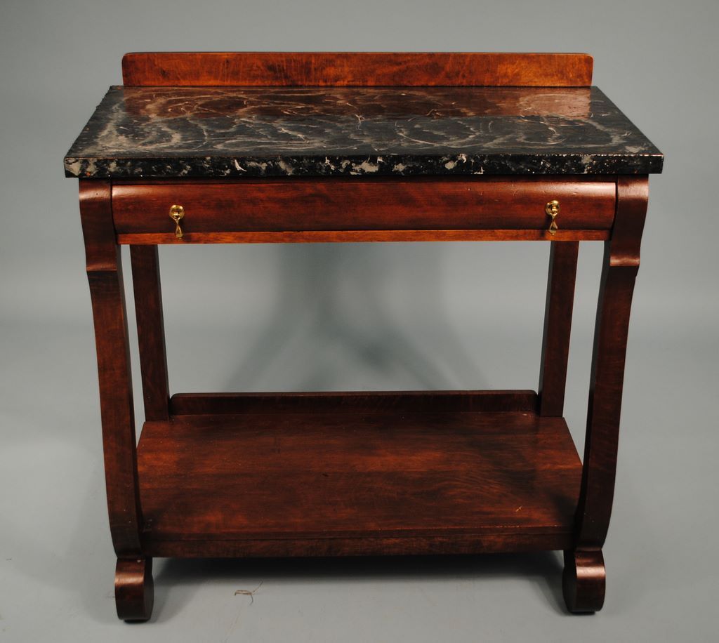 empire style mahogany server, center drawer, scroll legs, wood top has been faux marbled black and white design 37 1/2""w, 19 1/2"d,38 1/2"h. empire style mahogany server, center drawer, scroll legs, wood top has been faux marbled black and white design 37 1/2""w, 19 1/2"d,38 1/2"h.