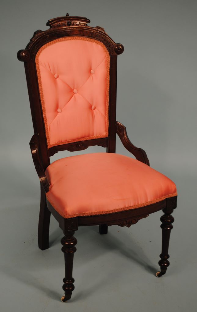 Victorian renaissance side chair covered in shrimp colored satin (matches lot 383) Victorian renaissance side chair covered in shrimp colored satin (matches lot 383)