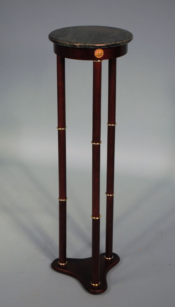 mahogany pedestal with three round legs leading to clover leaf base, marble top 12" dia,39 1/2"h mahogany pedestal with three round legs leading to clover leaf base, marble top 12" dia,39 1/2"h